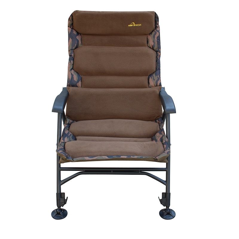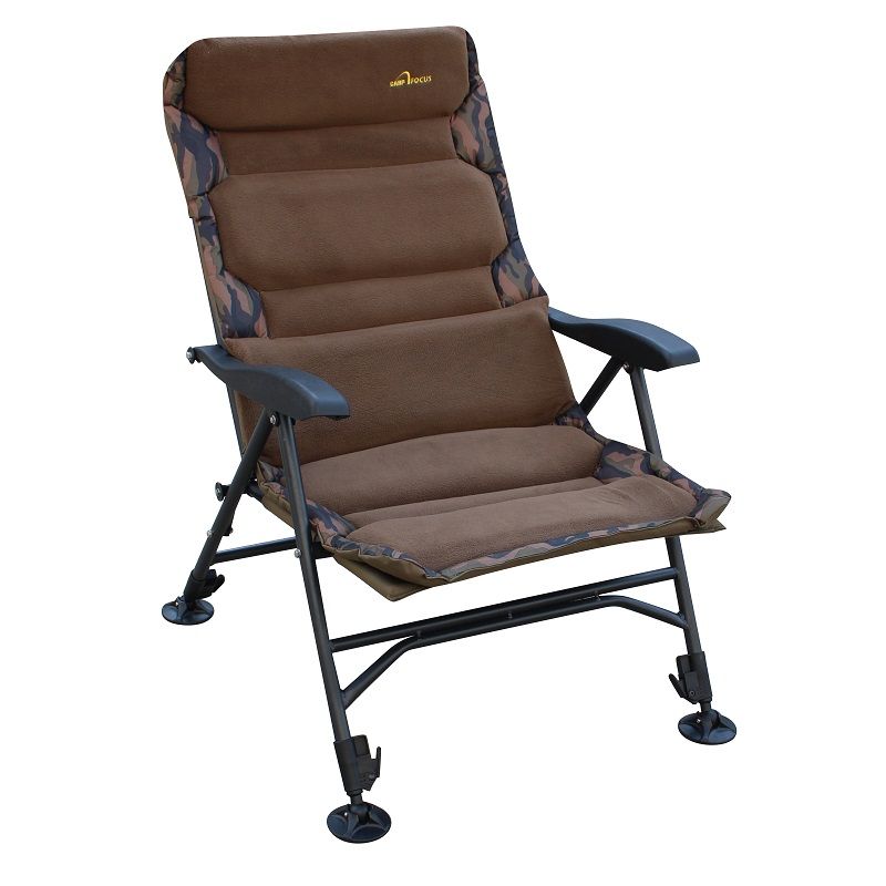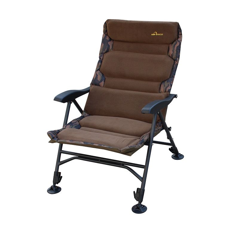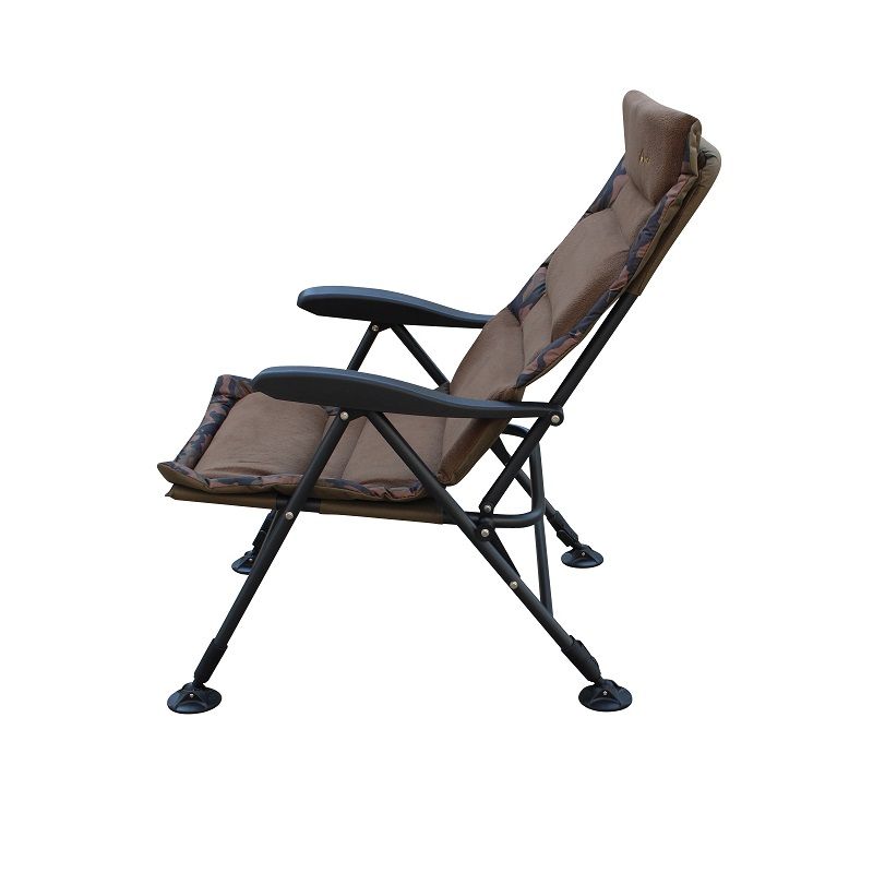 Лек, удобен и с възможност за бързо регулиране на позицията на облегалката посредством повдигане на подлакътниците. Всеки от четирите телескопични крака се регулира самостоятелно във височина в зависимост от наклона на терена. Подплатена облегалка от 600D Oxford материал с полар. Камуфлажни кантове. Прахово боядисана метална конструкция.