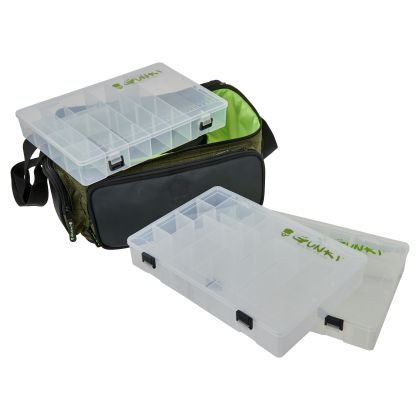 Чанта за съхранение на всичко необходимо за спининг. Съдържа голямо основно отделение с цип, три по-малки външни джоба с цип, дръжки за ръце и регулируема подплатена презрамка. Здравата и издръжлива материя е допълнена от висококачествени ципове. Всичко в дизайн Gunki. Включва и три кутии за примамки с размери 31.5x23x5 см. Размери на чантата: 35x23x18 см.