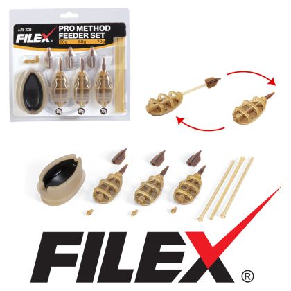 Комплектът FILEX PRO METHOD FEEDER е един от най-добрите комплекти в нашето предложение, защото с него сте готови за всякакъв повод във водата и може бързо да се сменя с помощта на тръбички за различни ситуации. В този комплект имате всичко необходимо за успешен риболов с метод фидер, независимо дали става въпрос за замятане на нормални или дълги разстояния с нашите нови хранилки FILEX PRO METHOD. Тази хранилка е „рестайлинг“ на нашата популярна хранилка EXTRA CARP METHOD IN LINE, която нашата компания е проектирала и произвела преди почти две десетилетия! Тази форма на хранилка е много популярна сред рибарите в цяла Европа и е привлякла вниманието на много рибари и марки да я произведат или да направят нещо подобно! Сега имаме честта да я прехвърлим от нашата марка EXTRA CARP към марката/серията FIL FISHING (FILEX PRO) в още по-добро издание! Тази хранилка вече има по-добра позиция на тежестта за още по-далечно замятане и по-точно разпадане (позициониране) на дъното на езеро или река. Тръбата вече е със същия размер като на всички наши хранилки FILEX от серията QC, така че е по-стабилна и компактна с FILEX ДЪЛГИ ТРЪБИ, FILEX КЪСИ ТРЪБИ и FILEX БЪРЗОСМЯНЯЕМИ ЕЛАСТИЧНИ ТРЪБИ.